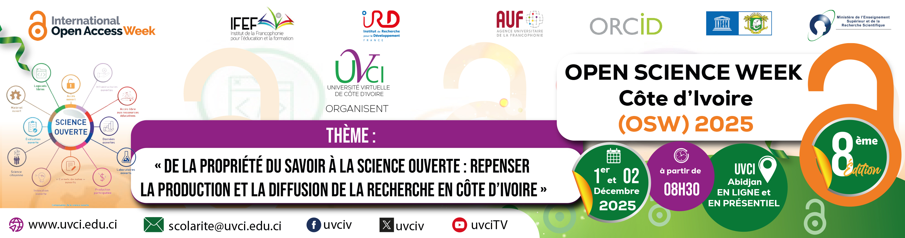 Institutionnalisée en Côte d’Ivoire, depuis 2018, l’édition de l’Open Access Week 2025 est organisée par l’Université Virtuelle de Côte d’Ivoire (UVCI), en collaboration avec le Ministère de l’Enseignement Supérieur et de la Recherche Scientifique, la Délégation Permanente de la Côte d’Ivoire auprès de l’UNESCO, la Commission Nationale Ivoirienne pour l’UNESCO, l’Agence Universitaire de la Francophonie et le Réseau de Télécommunication pour l’Enseignement et la Recherche (RITER).